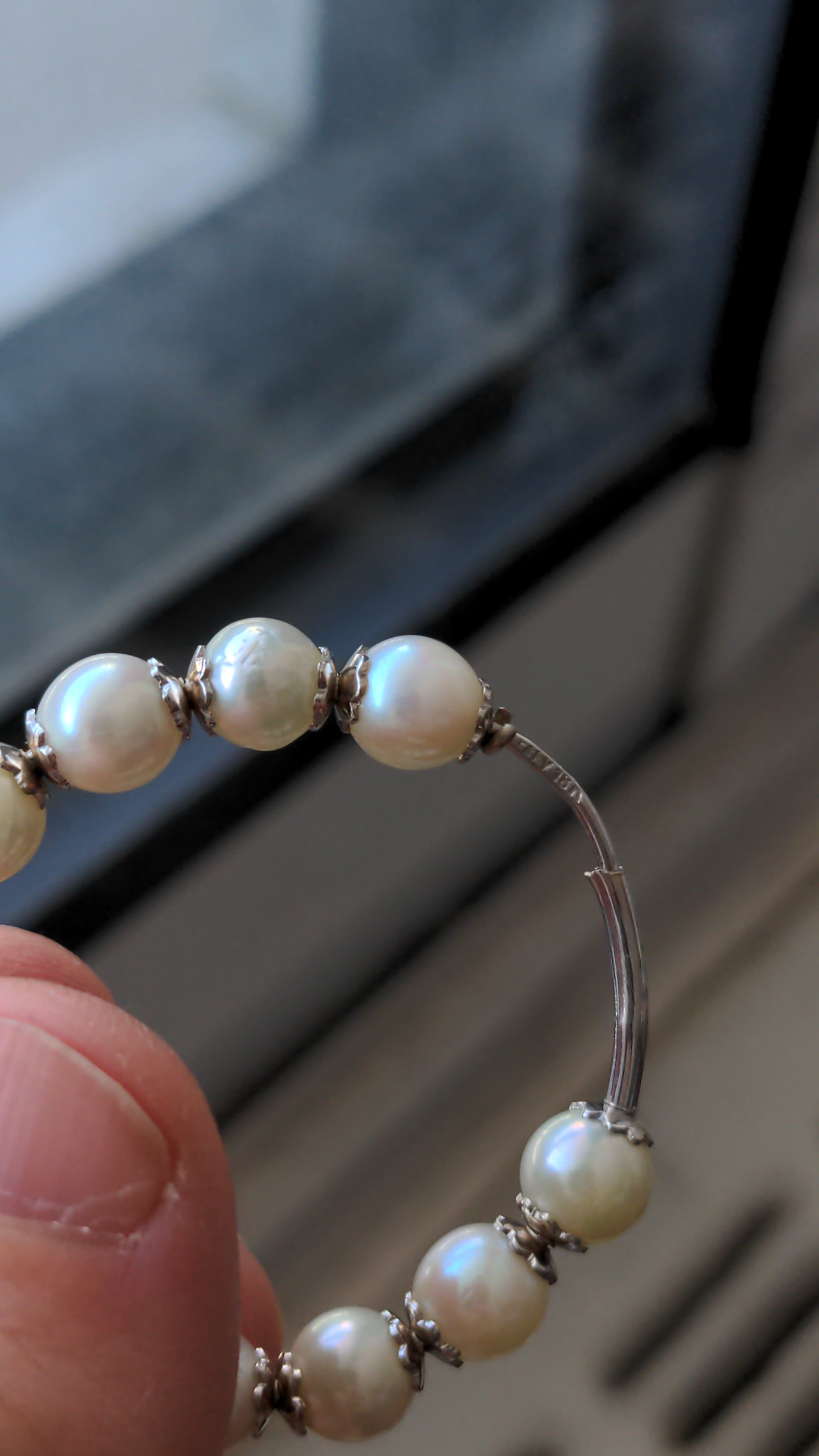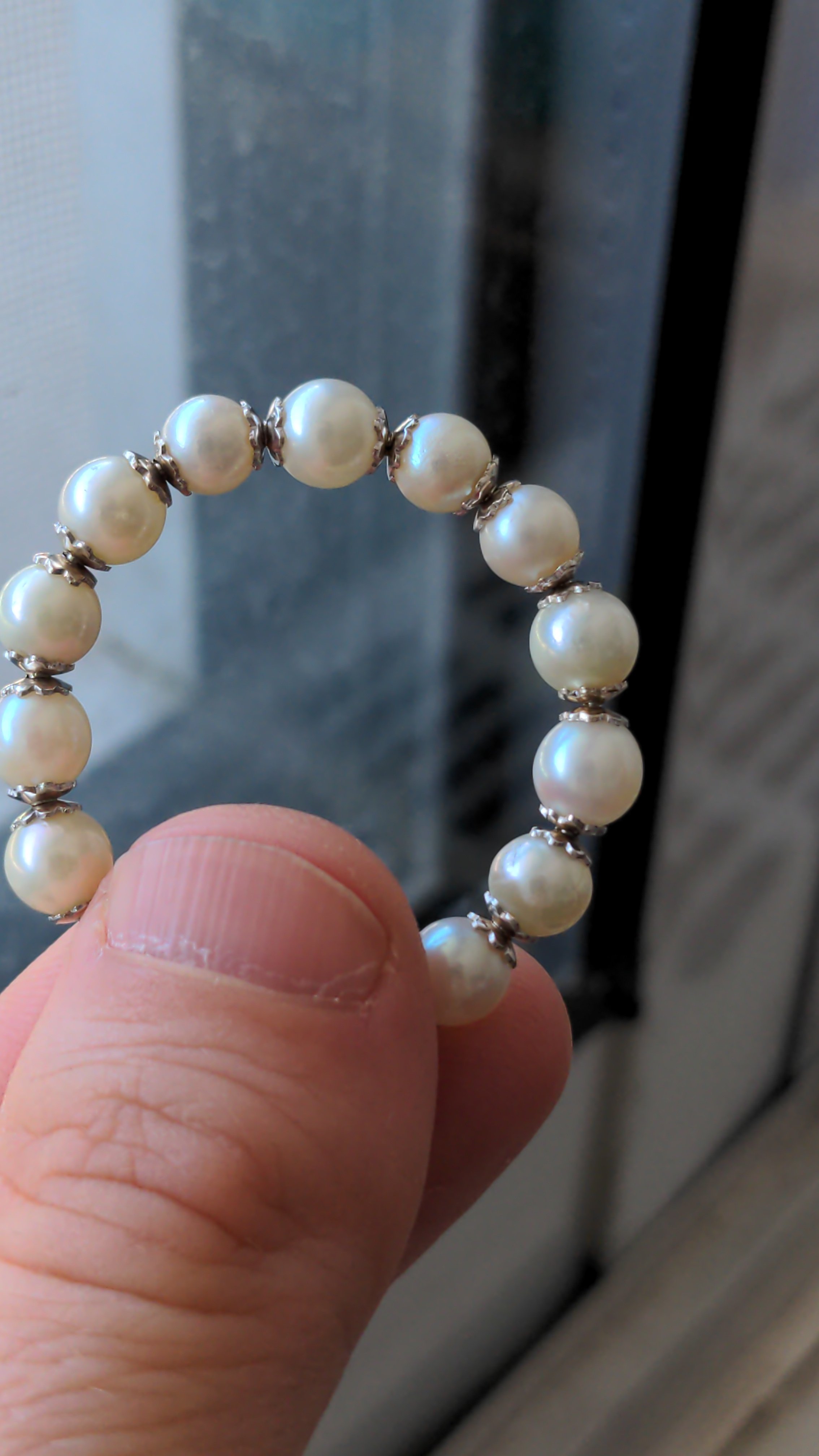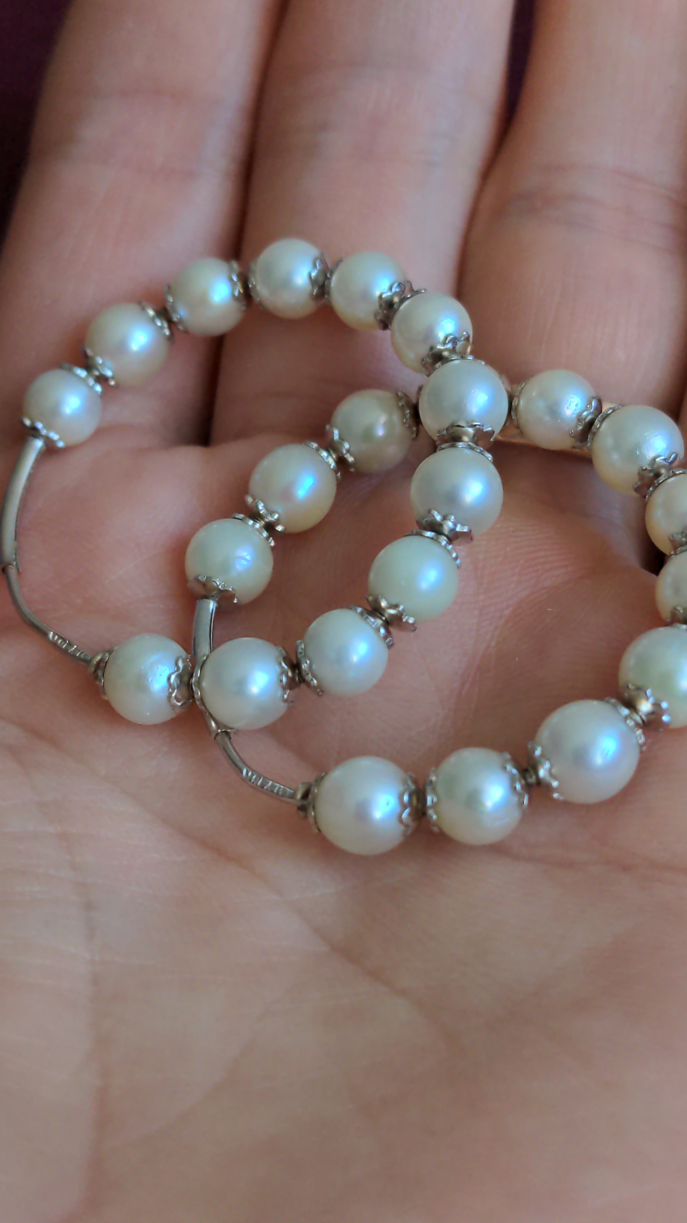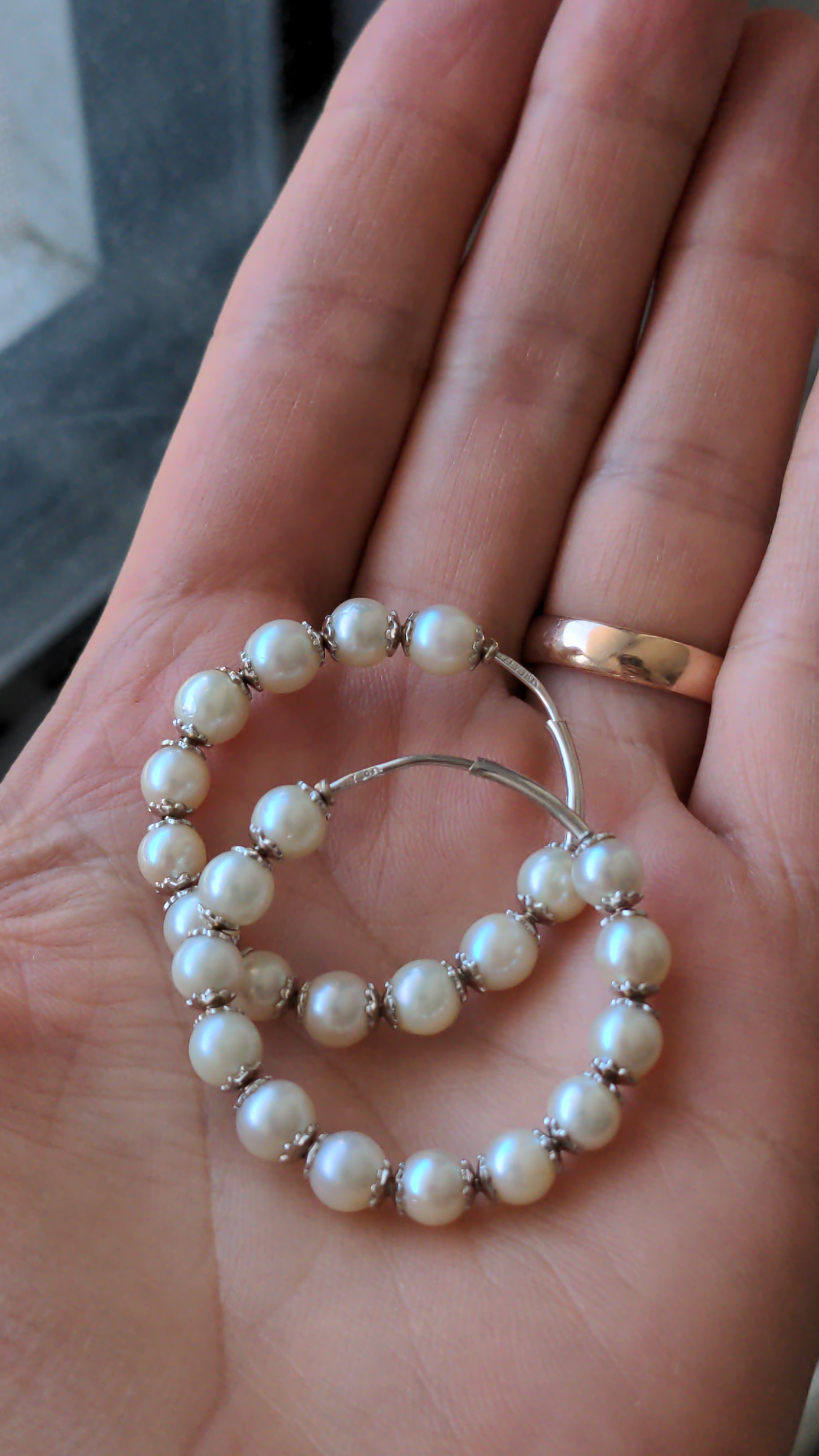 I have a pair of what I think are vintage pearl hoop earrings from the 70s to 90s. Each pearl has a pair of 18k gold endcaps, and I included a photo of the stamp but it may be hard to see; it says "Italy 18k". The pearls are all similar size but not exactly the same (around 5 mm diameter on average), and most of them have imperfections like a rippled surface or some pockmarks. The pearls feel gritty on my teeth so I think they are real.