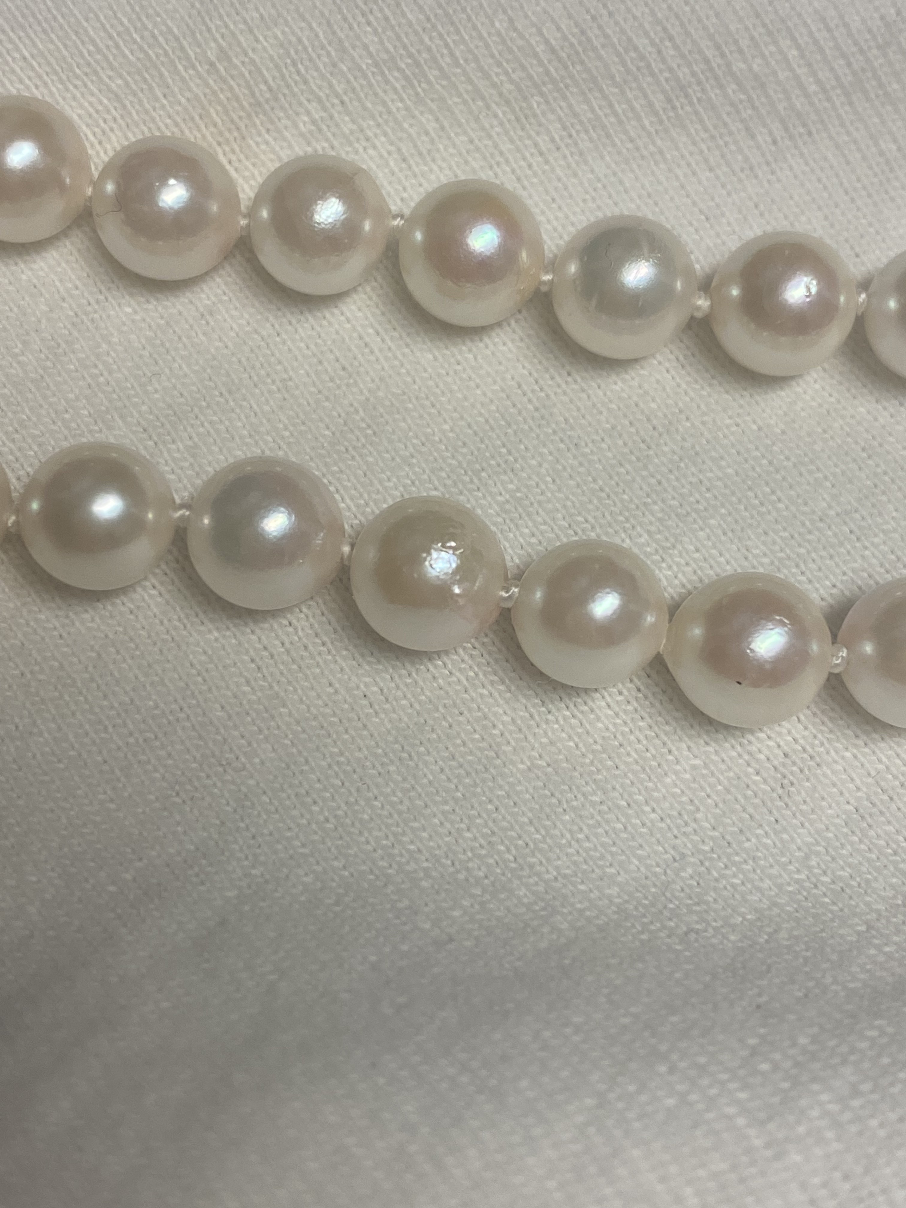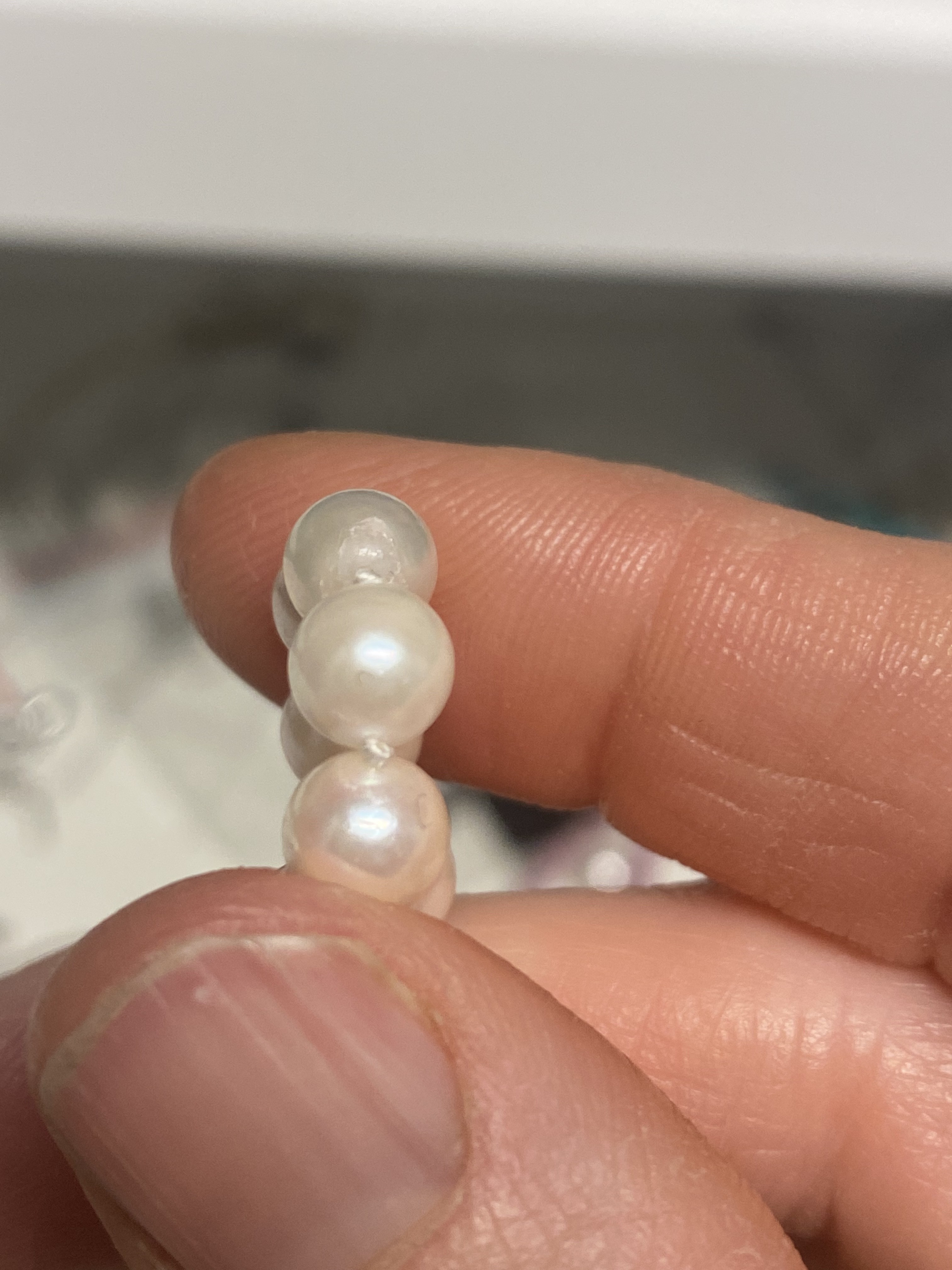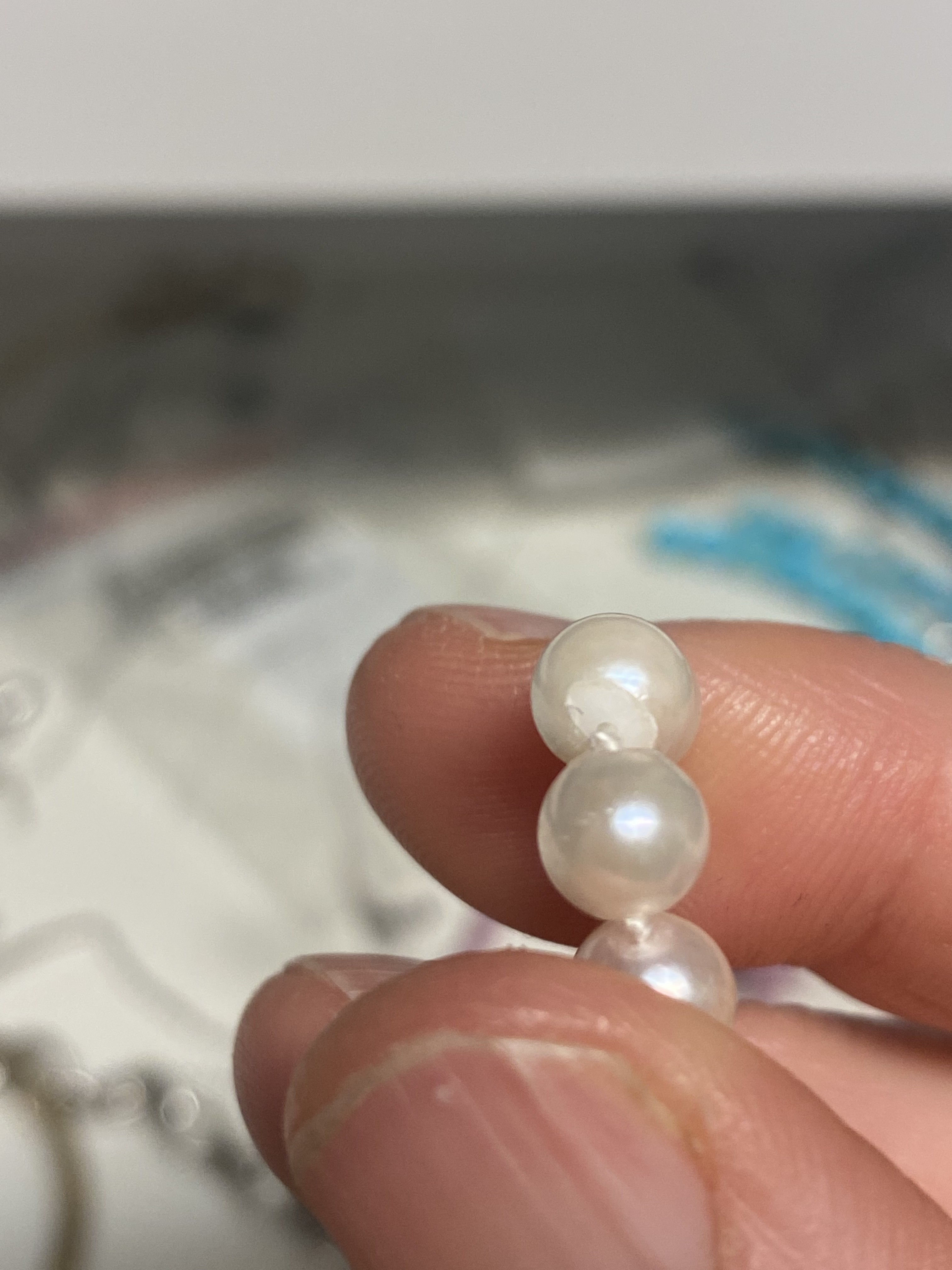 I have had this strand for 20 years now. I bought them at Macy's in late 1990-early 2000. I have had re-stung 2x now. Worn a lot. 14kt stamped clasp. Pearls measure roughly 6mm, uniform. What type are these and what happened? Looks like nacre chipped or peeled off by drill hole. The ones pictured are worse, but others show similar but more minor damage by hole. Is this something that will naturally happen with re-stringing frequently? Like, should I not try to replace bad ones and just enjoy this while it lasts? Thanks!