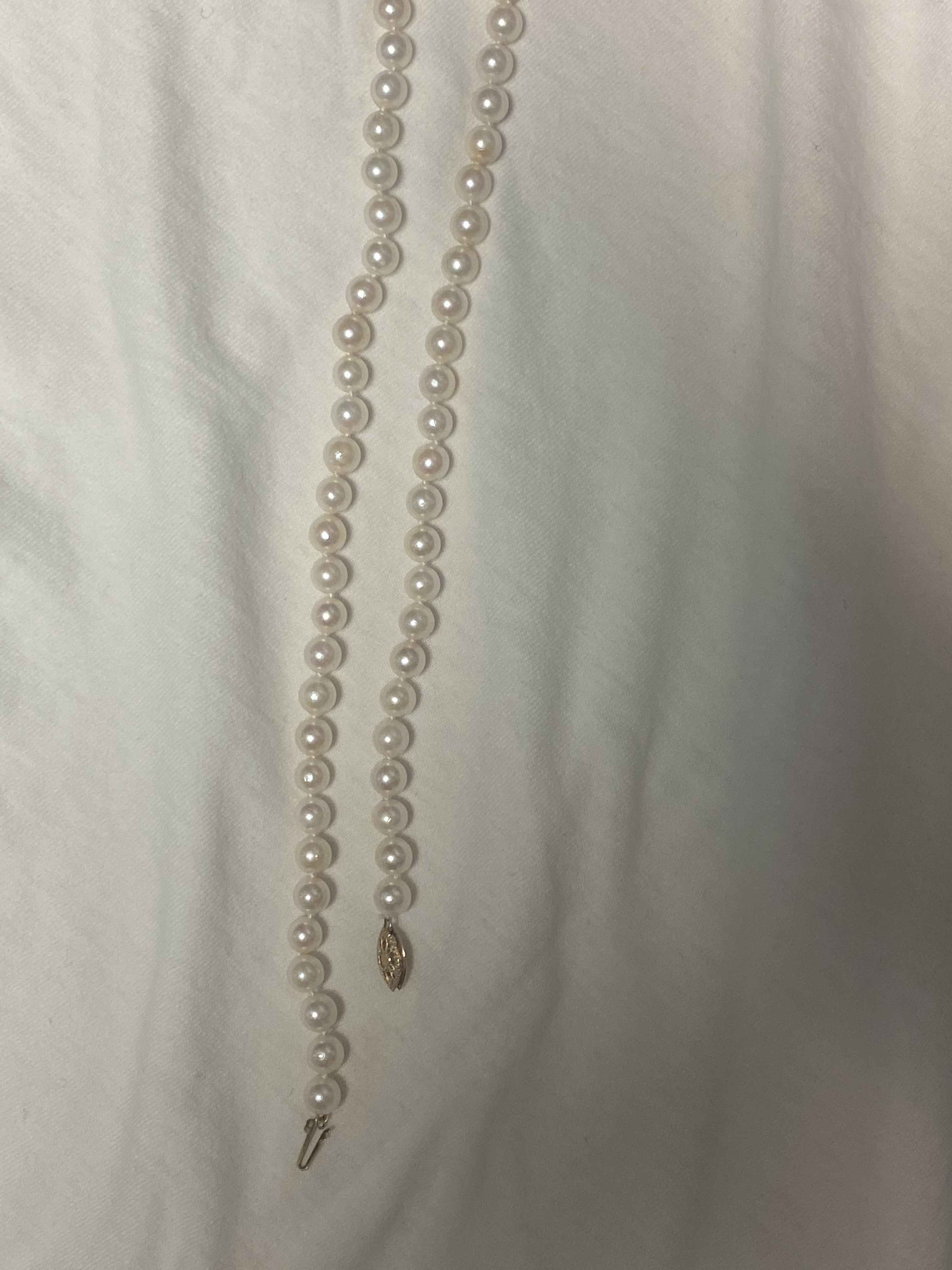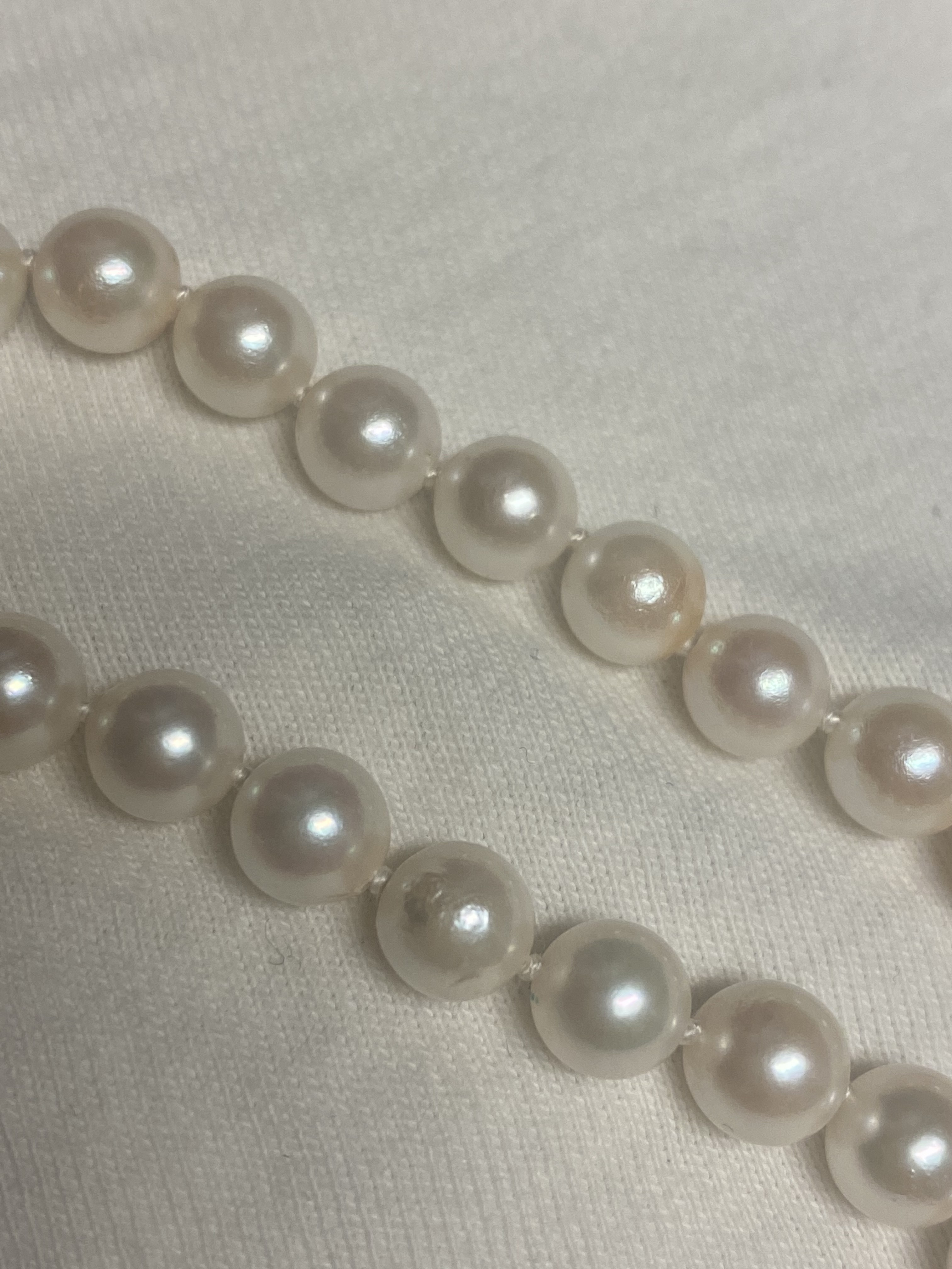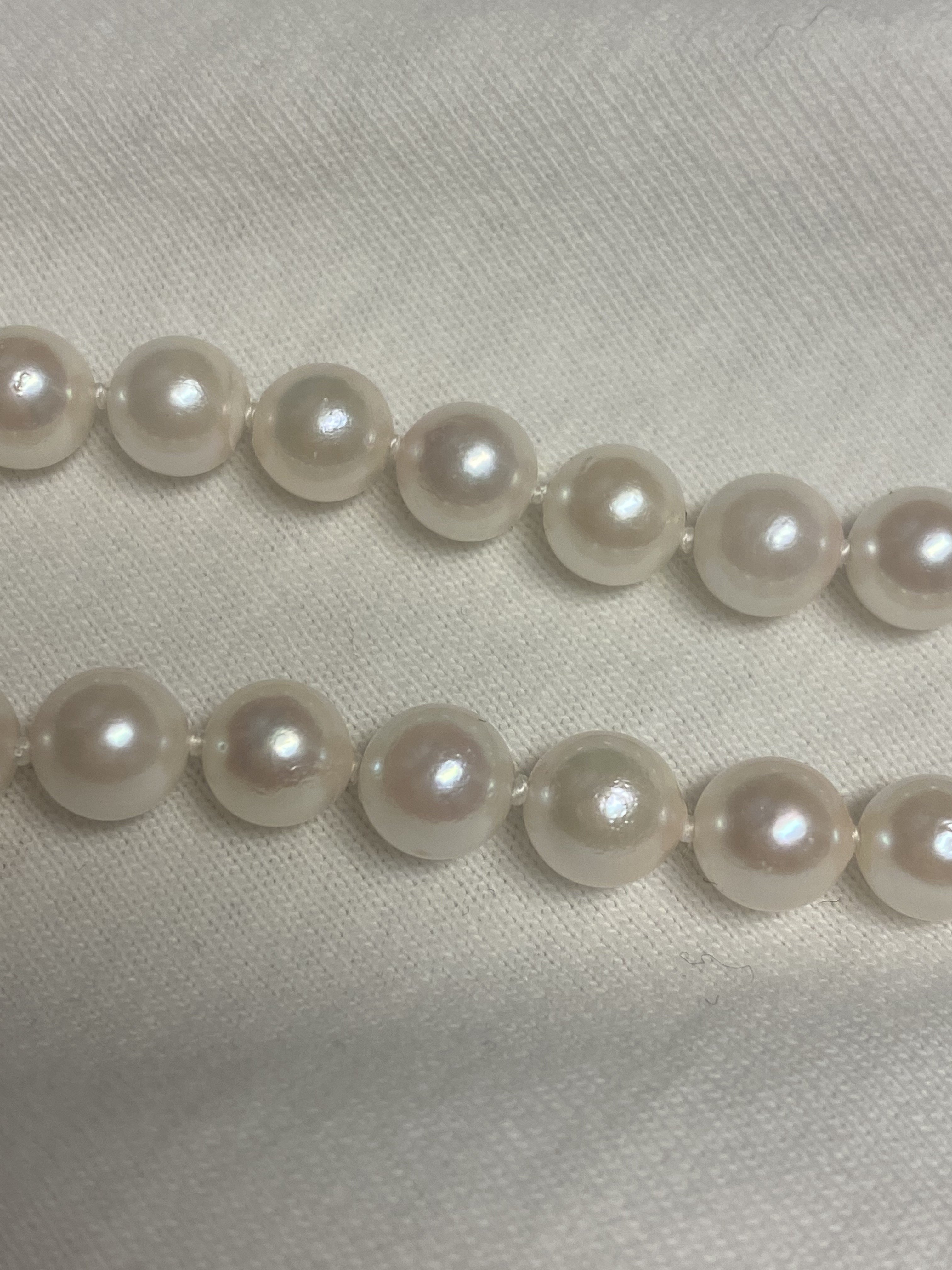 I have had this strand for 20 years now. I bought them at Macy's in late 1990-early 2000. I have had re-stung 2x now. Worn a lot. 14kt stamped clasp. Pearls measure roughly 6mm, uniform. What type are these and what happened? Looks like nacre chipped or peeled off by drill hole. The ones pictured are worse, but others show similar but more minor damage by hole. Is this something that will naturally happen with re-stringing frequently? Like, should I not try to replace bad ones and just enjoy this while it lasts? Thanks!