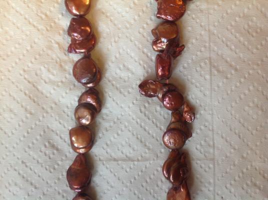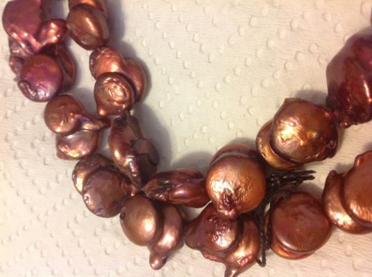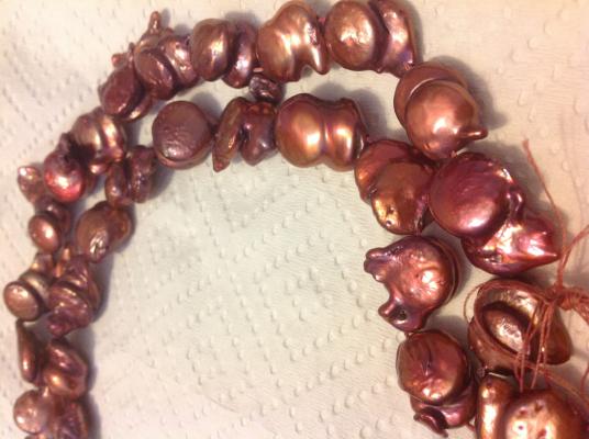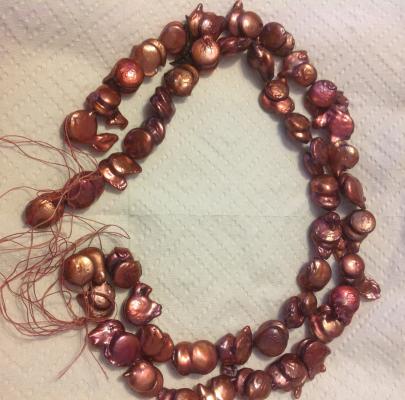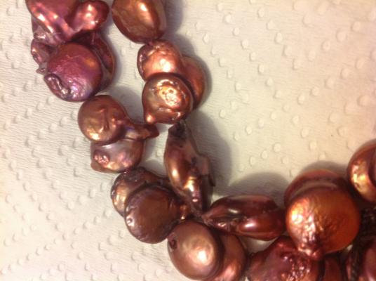 The nacre covers two and even three "coins" around most of two strands, clumping them together, with some pretty unsightly nacre messy tails as well.